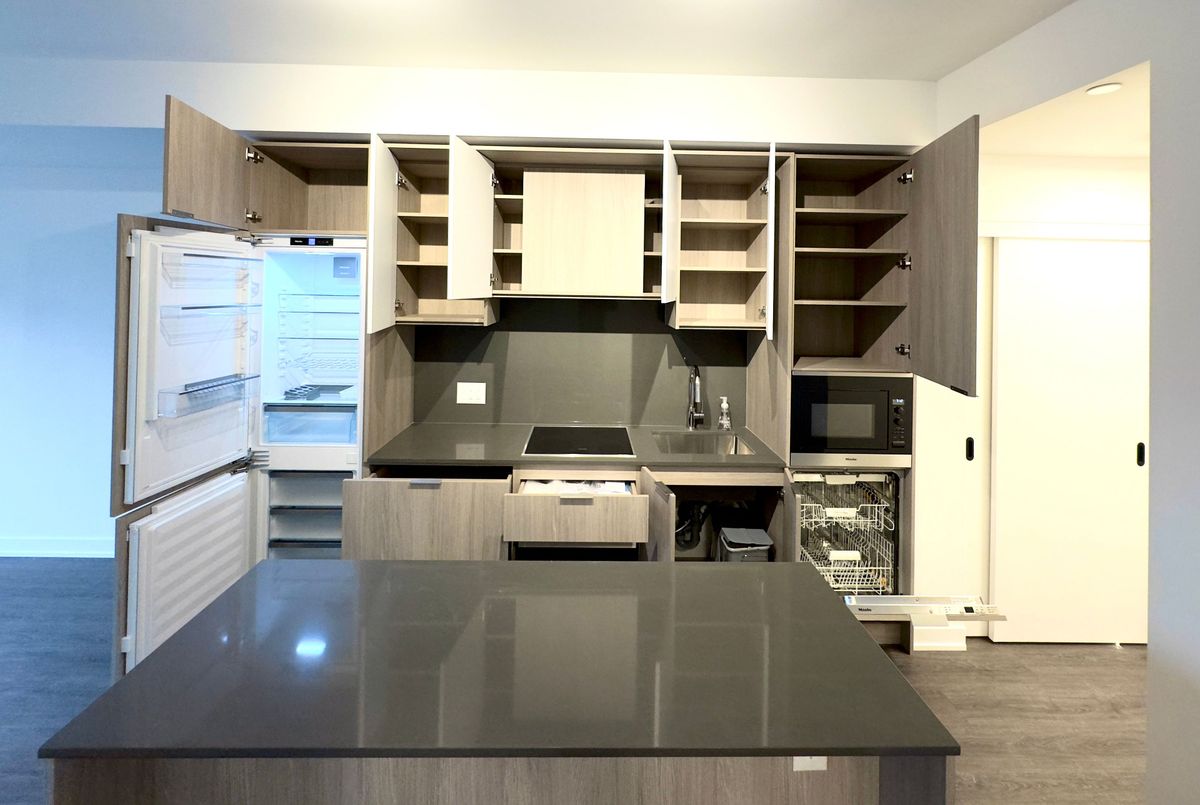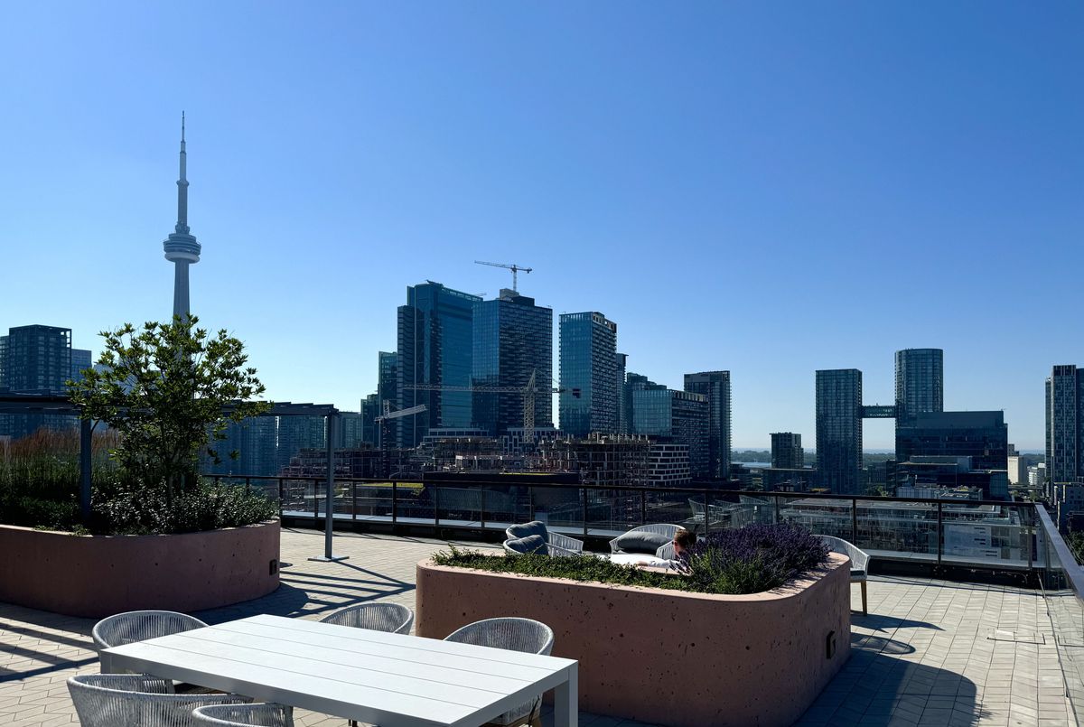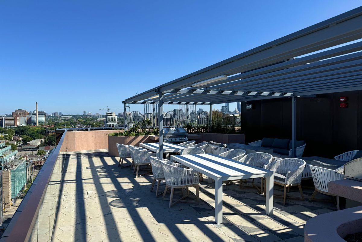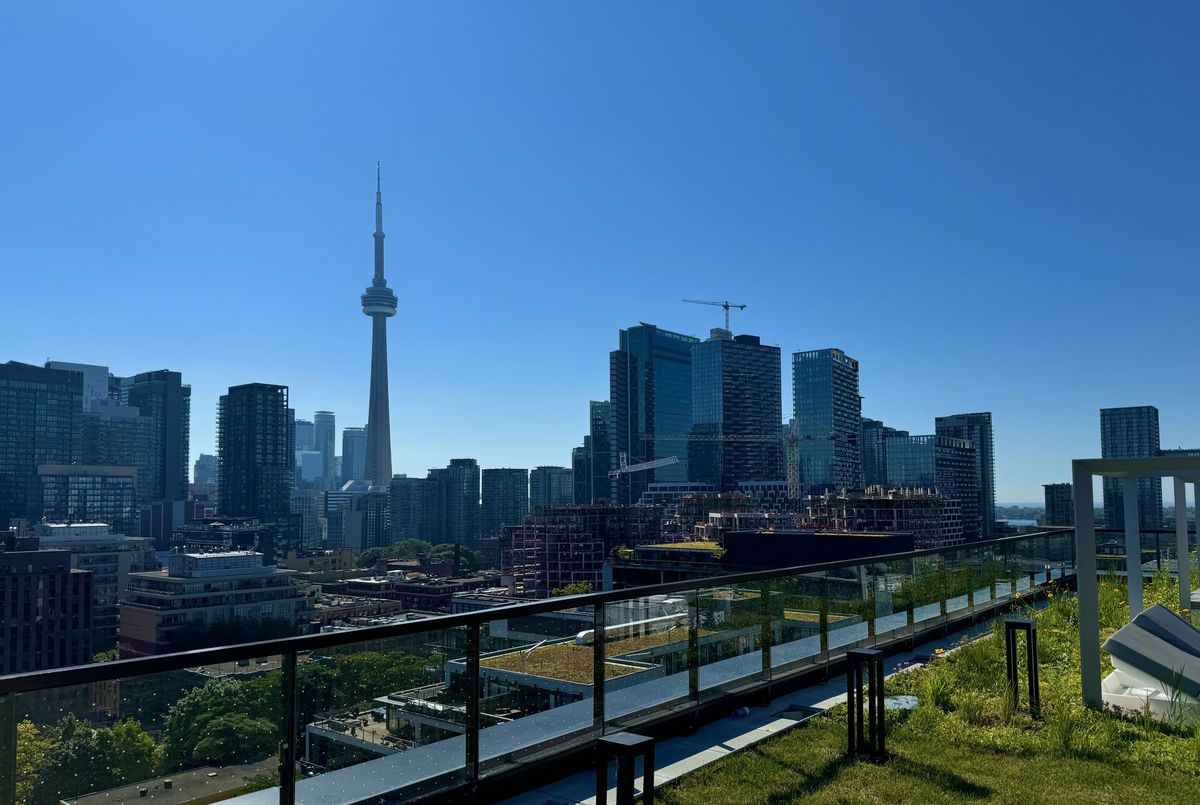 Welcome to this sun-drenched suite (1 bedroom + den) offering a smart open-concept layout with floor-to-ceiling windows that flood the space with natural light. The sleek, modern kitchen features built-in appliances and an extra-large centre island that serves as a perfect dining or entertaining space. Thoughtfully designed for comfortable urban living, the layout maximizes every square foot, blending style and practicality in one of downtown's most sought-after buildings. The den can be converted into a generously-sized bedroom. CONDO AMENITIES: Residents enjoy boutique-style amenities with 24/7 concierge service and thoughtfully curated spaces throughout. The rooftop terrace with a view of the CN Tower, featuring secluded cabanas outfitted with BBQ grills, fireplaces, dining tables, and luxurious lounge seating - perfect for entertaining or unwinding above the city. The fully equipped gym includes smart TVs, cardio equipment, a universal gravity machine, and ample aerobic space. A stylish resident lounge offers relaxed seating, Wi-Fi connectivity, a mounted TV, and a beautiful fireplace, while the private kitchen bar and dining room can be reserved for special events. Additional conveniences include a pet wash station, visitor and residential bicycle parking, and electric vehicle charger access. LOCATION*LOCATION*LOCATION: Situated in the heart of the vibrant King West Fashion District, this location offers unbeatable walkability. Step down to the energy of King Street West, grab coffee along Queen Street West, or relax at St. Andrew's Playground with its enclosed dog park. Just minutes to Toronto Western Hospital, Trinity Bellwoods Park, Rogers Centre, The Well, Union Station, and Eaton Centre. With TTC transit, grocery stores, fine dining, nightlife, and everyday essentials just steps away, this is true downtown living with a Walk and Transit Score of 100.